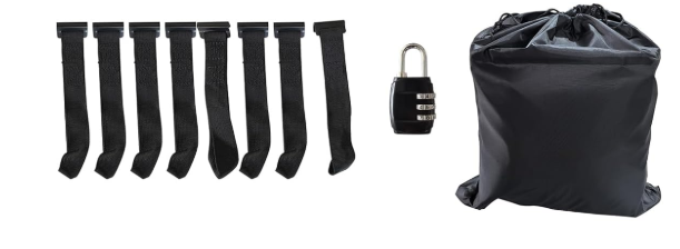 Miếng đệm bảo vệ, móc cửa, ổ khóa, túi dây rút.